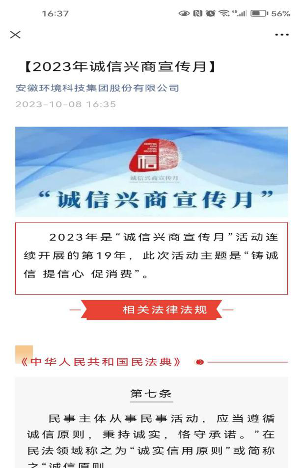 为进一步加强社会信用体系建设,弘扬诚信文化,引导企业增强诚信兴商理念,树牢诚实守信意识,省生态环境产业集团及各直属(控股)公司开展“诚信兴商”集中宣传月活动。
