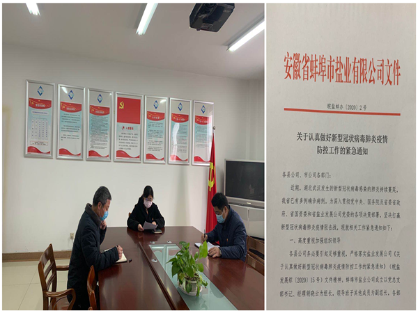 1月27日蚌埠盐业公司党总支召开了紧急会议,深入贯彻中央和上级党委有关疫情防控的各项决策部署,制定了《关于认真做好新型冠状病毒肺炎疫情防控工作的紧急通知》(皖盐蚌办〔2020〕2号)。成立了以党总支书记、经理为组长,总支班子成员为副组长,各部门主要负责人为成员的新型冠状病毒防控工作领导小组,要求市县公司全方位积极做好疫情防控,立即启动特殊时期食盐供应紧急预案,市县公司班子成员以及保障食盐供应的相关业务岗位人员,要第一时间全部到岗就位,坚守疫情防控第一线,坚守食盐保障供应第一线,实行24小时领导带班值班制,抗疫情,保供应,众志成城,义不容辞。