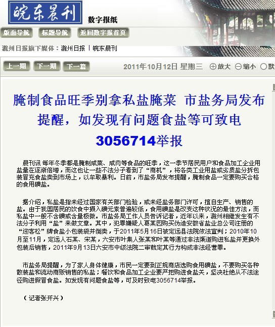《皖东晨刊》:市盐务局发布提醒 腌制食品旺季别拿私盐腌菜