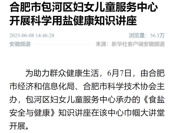 6月8日,新华社客户端安徽频道发表题为《合肥市包河区妇女儿童服务中心开展科学用盐健康知识讲座》的文章,截至发稿日浏览量达40.7万人次。